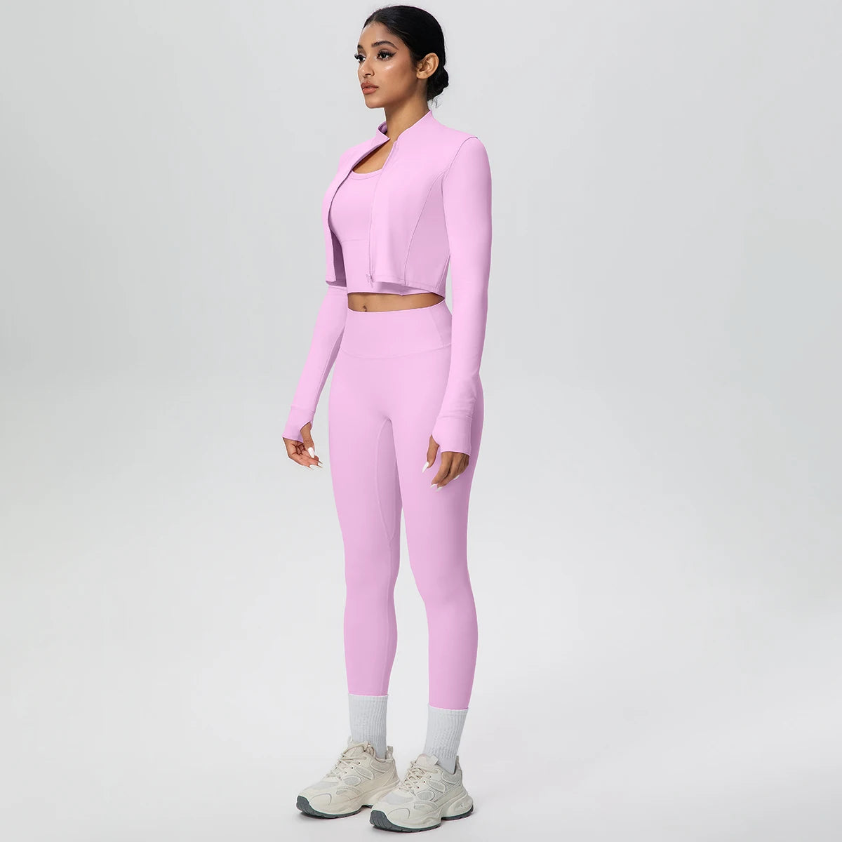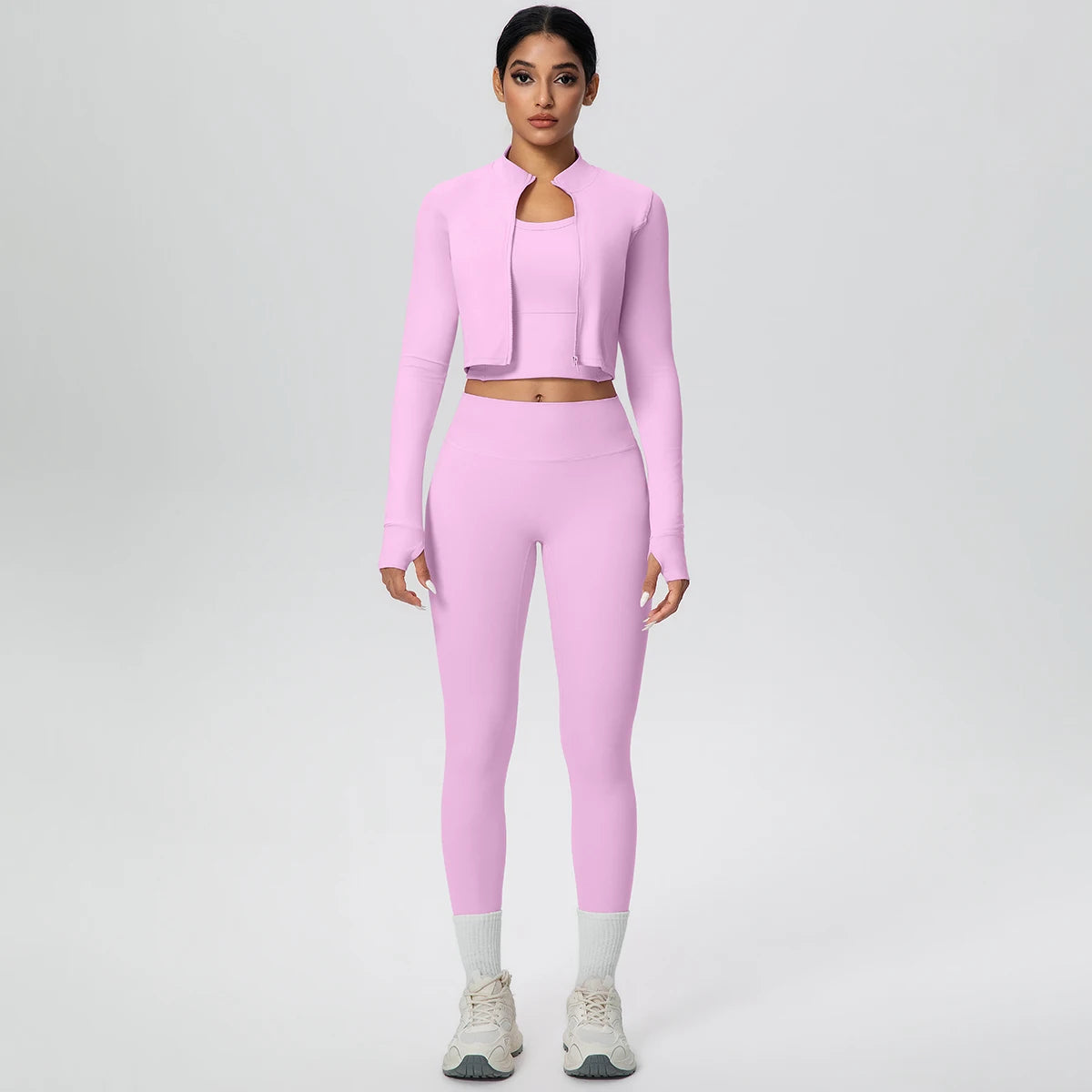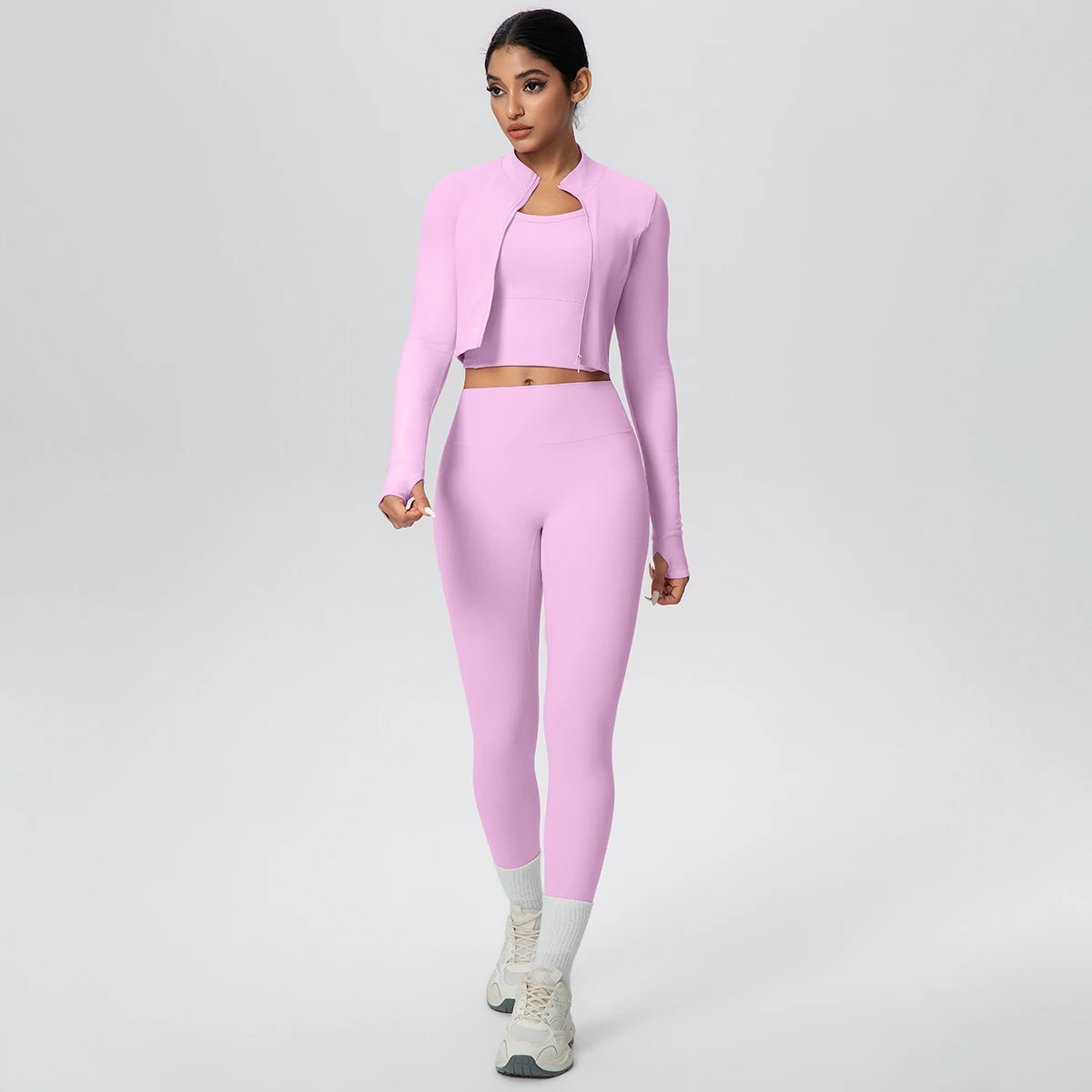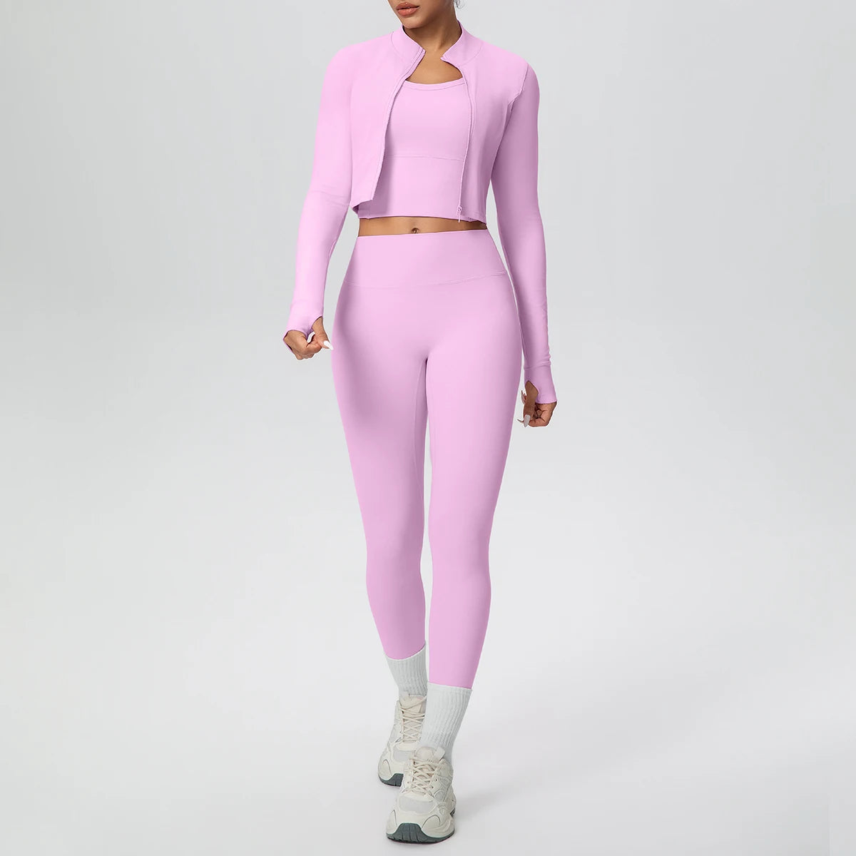 Get ready to flow through your workout in style with this complete three-piece yoga set. The padded sports bra top provides comfortable support, while the long sleeve crop jacket with thumbholes keeps you cozy during cooler sessions. Finish the look with four-way stretch ankle leggings that move with every pose. Whether you're hitting the mat or heading to brunch after class, this versatile set has you covered from top to bottom.