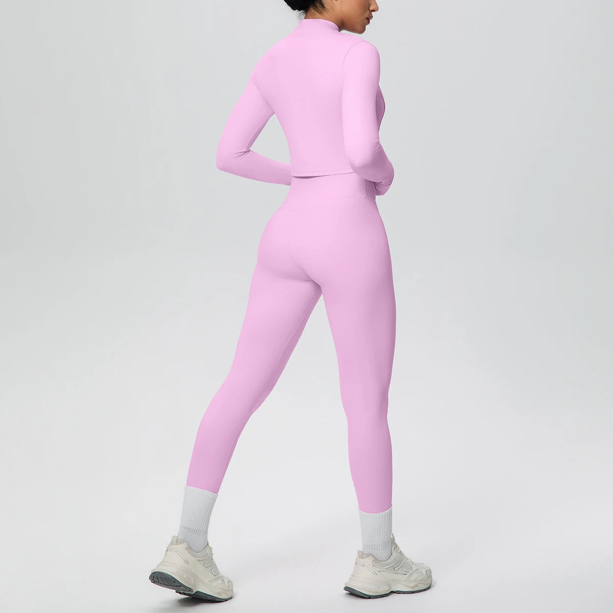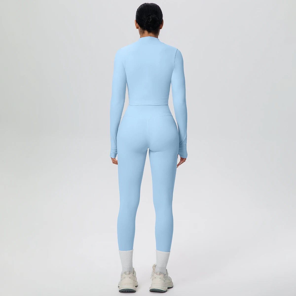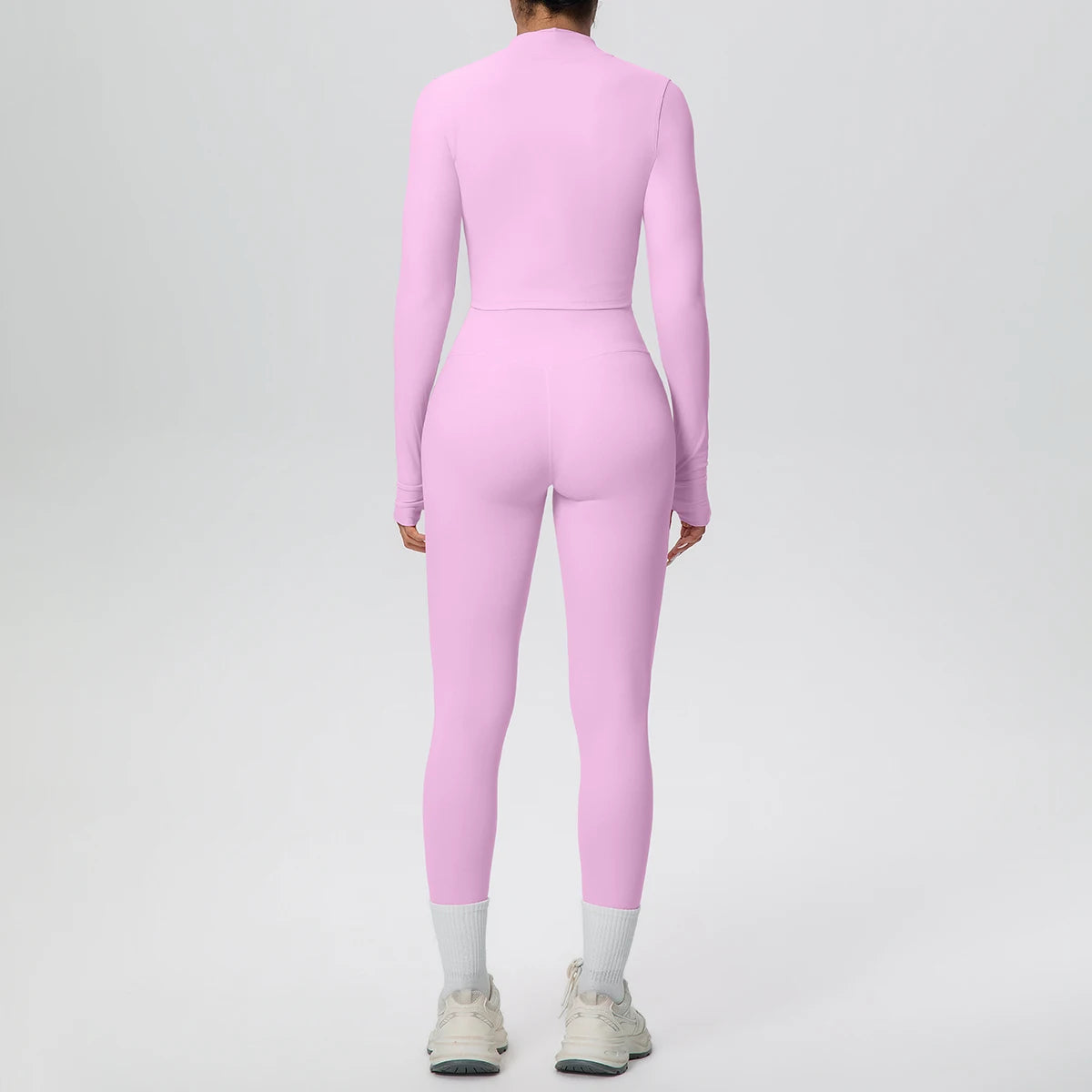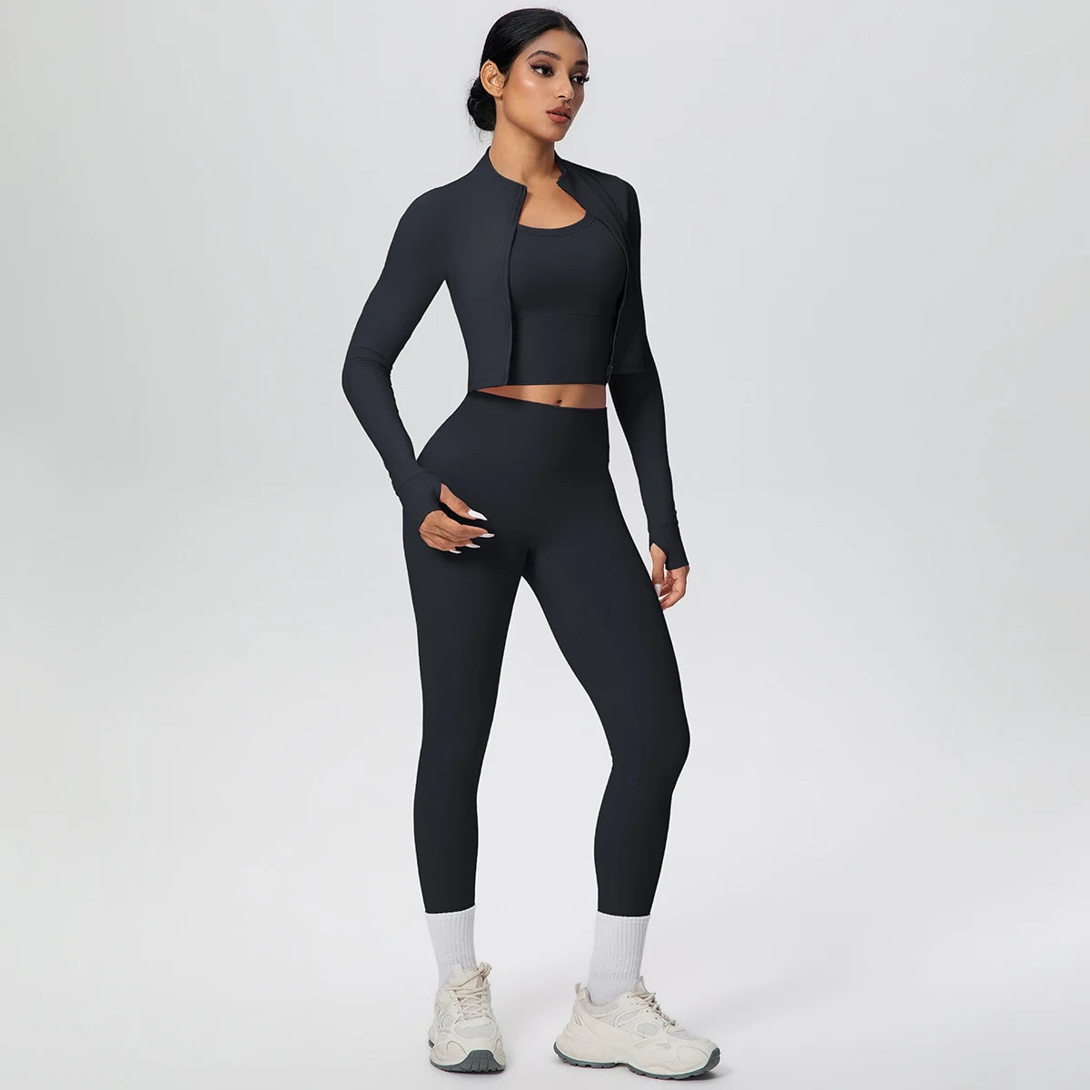 Get ready to flow through your workout in style with this complete three-piece yoga set. The padded sports bra top provides comfortable support, while the long sleeve crop jacket with thumbholes keeps you cozy during cooler sessions. Finish the look with four-way stretch ankle leggings that move with every pose. Whether you're hitting the mat or heading to brunch after class, this versatile set has you covered from top to bottom.